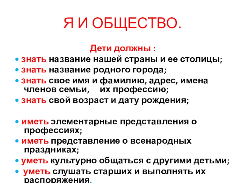 • знать свой возраст и дату рождения;