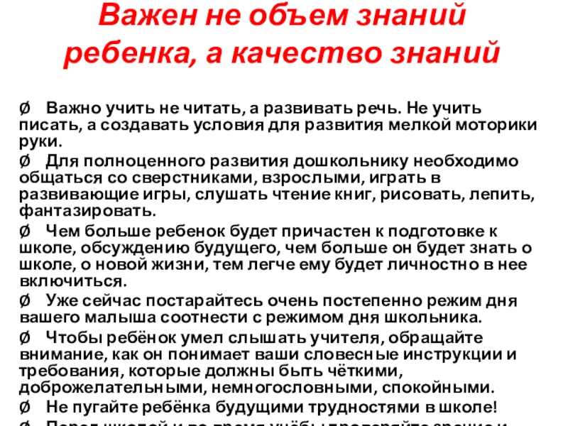 Слайд 14Важен не объем знаний ребенка, а качество знаний