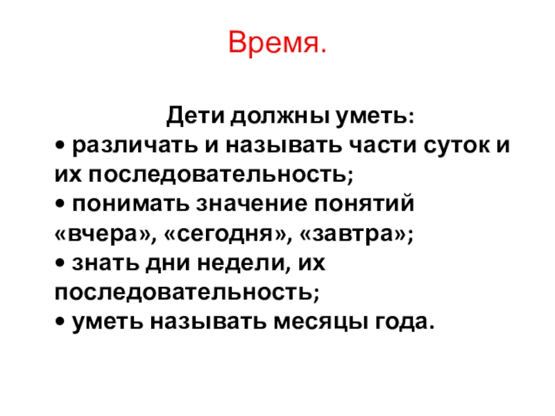 • понимать значение понятий «вчера», «сегодня», «завтра»;