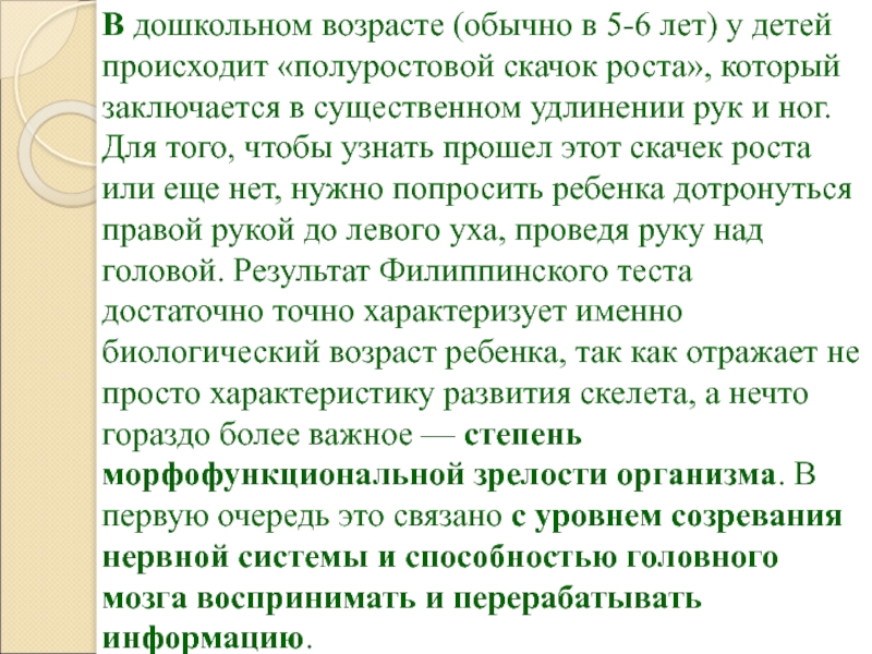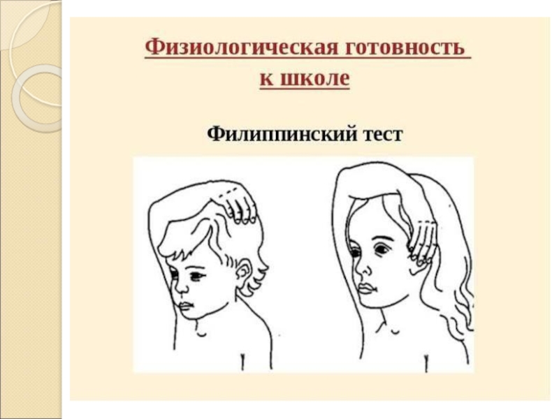 скачок роста», который заключается в существенном удлинении рук и ног. Для того, чтобы узнать прошел этот скачек роста или еще нет, нужно попросить ребенка дотронуться правой рукой до левого уха, проведя руку над головой. Результат Филиппинского теста достаточно точно характеризует именно биологический возраст ребенка, так как отражает не просто характеристику развития скелета, а нечто гораздо более важное — степень морфофункциональной зрелости организма. В первую очередь это связано с уровнем созревания нервной системы и способностью головного мозга воспринимать и перерабатывать информацию.