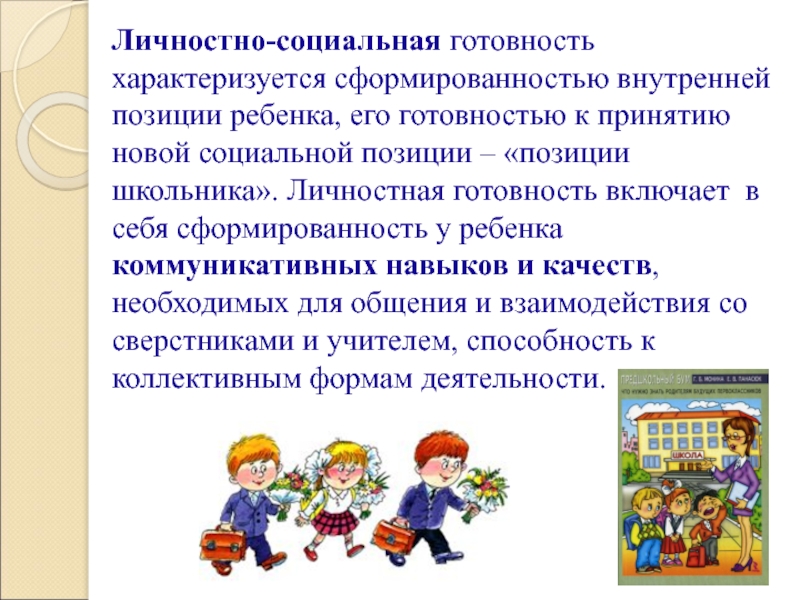 Личностно-социальная готовность характеризуется сформированностью внутренней позиции ребенка, его готовностью к принятию