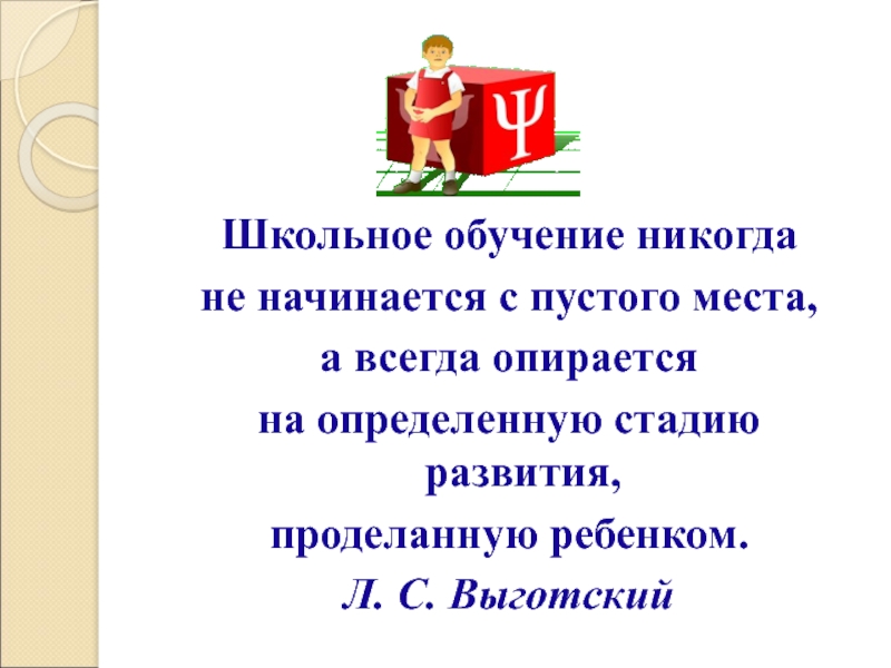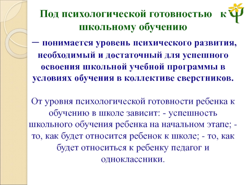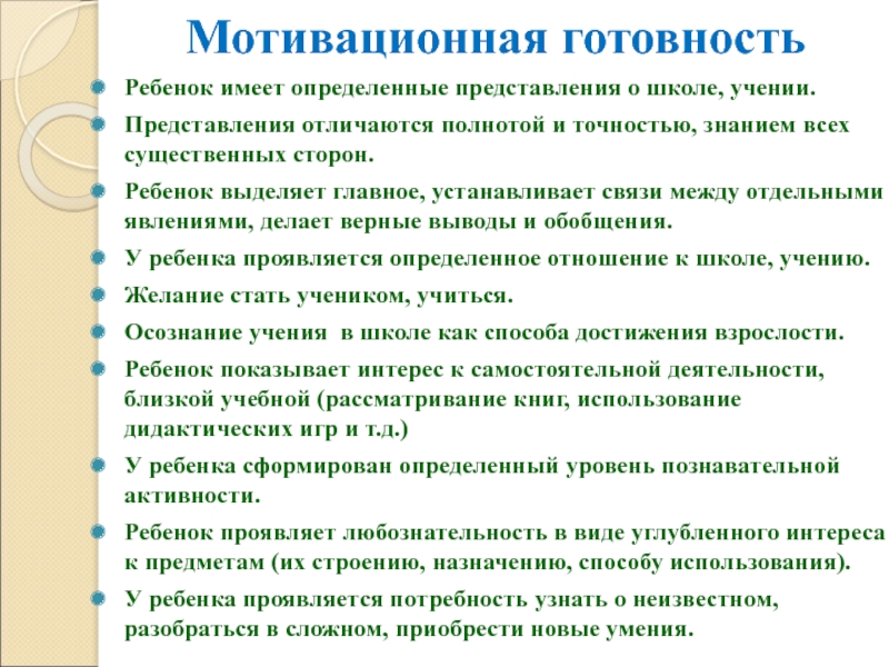 От уровня психологической готовности ребенка к обучению в школе зависит: - успешность школьного обучения ребенка на начальном этапе; - то, как будет относится ребенок к школе; - то, как будет относиться к ребенку педагог и одноклассники.