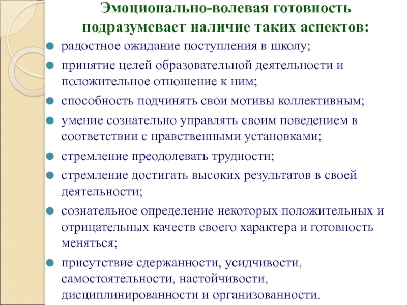 Эмоционально-волевая готовность подразумевает наличие таких аспектов: