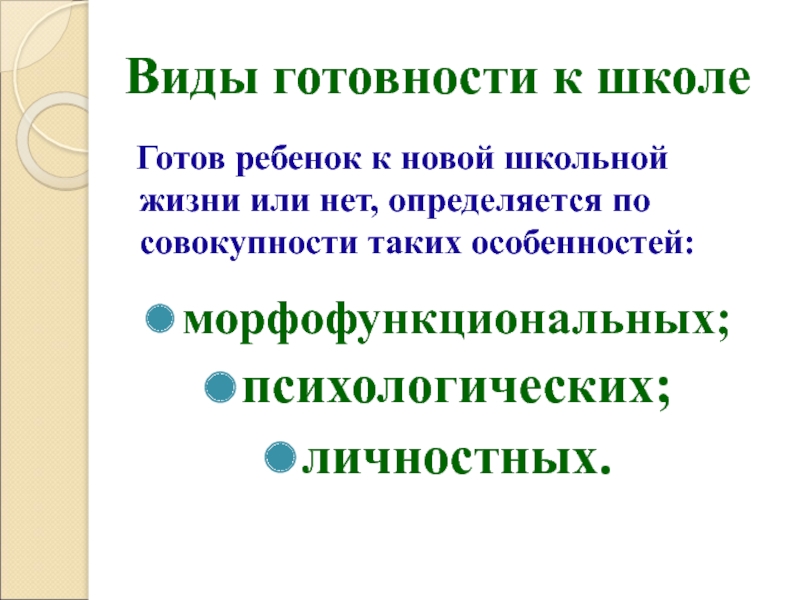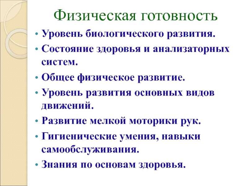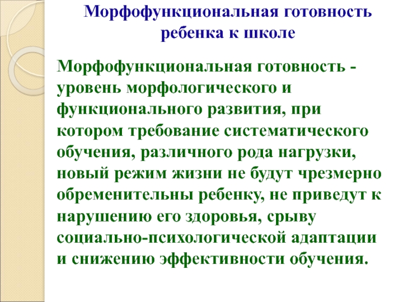 развития, при котором требование систематического обучения, различного рода нагрузки, новый режим жизни не будут чрезмерно обременительны ребенку, не приведут к нарушению его здоровья, срыву социально-психологической адаптации и снижению эффективности обучения.