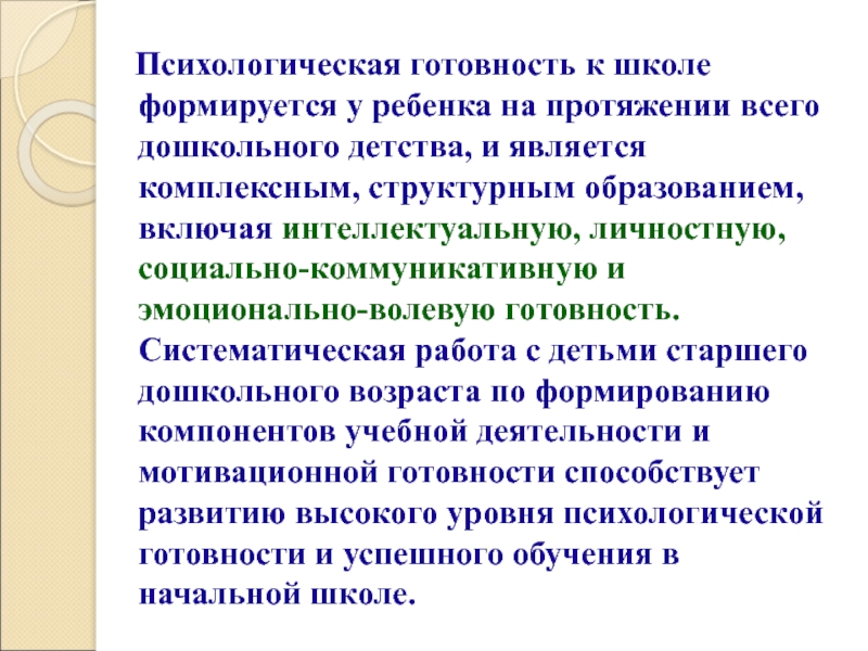 всего дошкольного детства, и является комплексным, структурным образованием, включая интеллектуальную, личностную, социально-коммуникативную и эмоционально-волевую готовность. Систематическая работа с детьми старшего дошкольного возраста по формированию компонентов учебной деятельности и мотивационной готовности способствует развитию высокого уровня психологической готовности и успешного обучения в начальной школе.