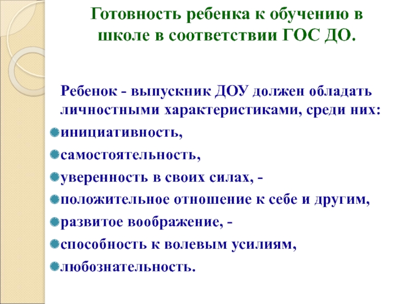 Слайд 22Готовность ребенка к обучению в школе в соответствии ГОС ДО.
