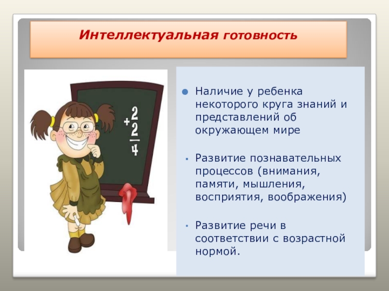 Интеллектуальная готовность Наличие у ребенка некоторого круга знаний и представлений об окружающем миреРазвитие познавательных процессов (внимания,