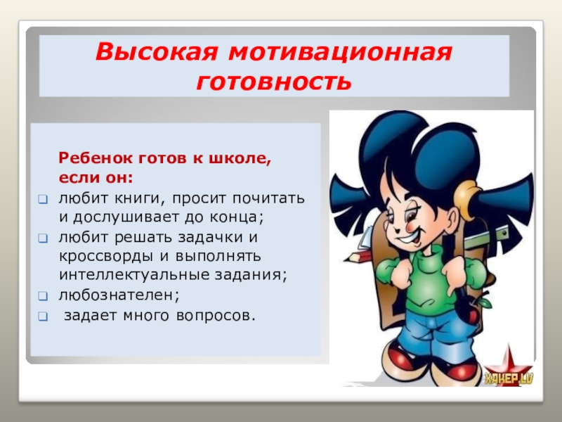 Высокая мотивационная   готовность   Ребенок готов к школе, если он:любит книги, просит почитать и