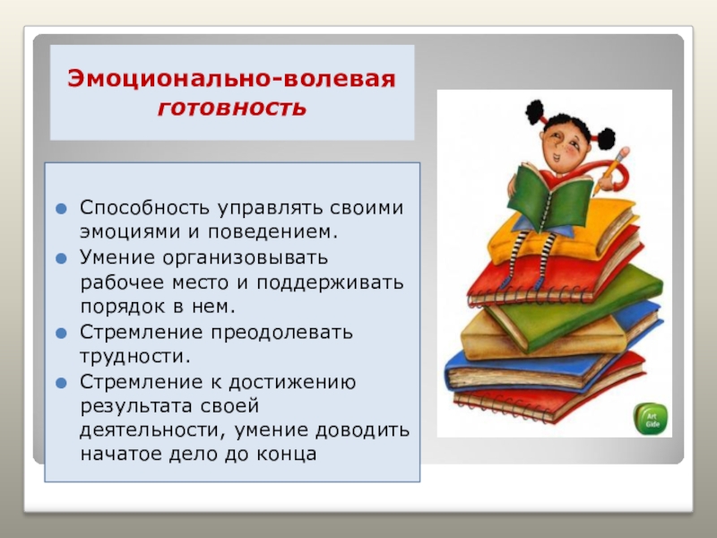 Эмоционально-волевая готовностьСпособность управлять своими эмоциями и поведением.Умение организовывать рабочее место и поддерживать порядок в нем.Стремление преодолевать трудности.Стремление