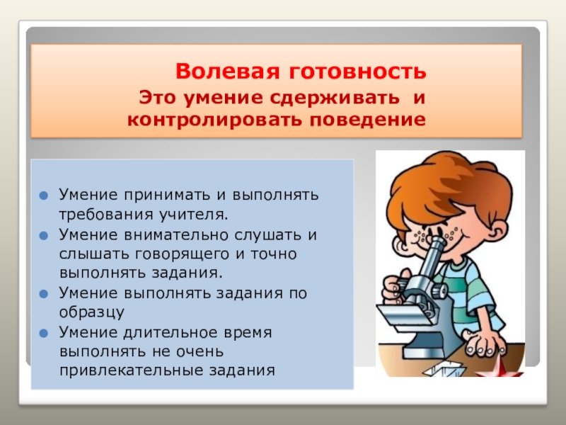 Волевая готовность  Это умение сдерживать и контролировать поведениеУмение принимать и выполнять требования учителя.Умение