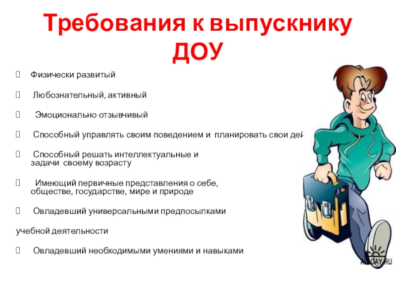 Слайд 2Требования к выпускнику ДОУ