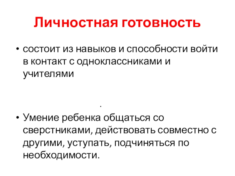 Личностная готовность.состоит из навыков и способности войти в контакт с одноклассниками и учителямиУмение ребенка общаться со сверстниками,