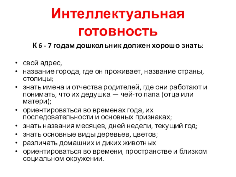 Интеллектуальная готовностьК 6 - 7 годам дошкольник должен хорошо знать:свой адрес, название города, где он проживает, название