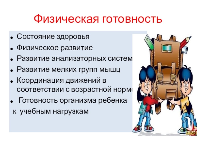 Физическая готовностьСостояние здоровьяФизическое развитиеРазвитие анализаторных системРазвитие мелких групп мышцКоординация движений в соответствии с возрастной нормой Готовность организма