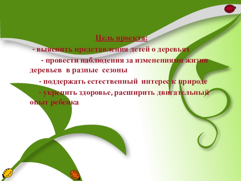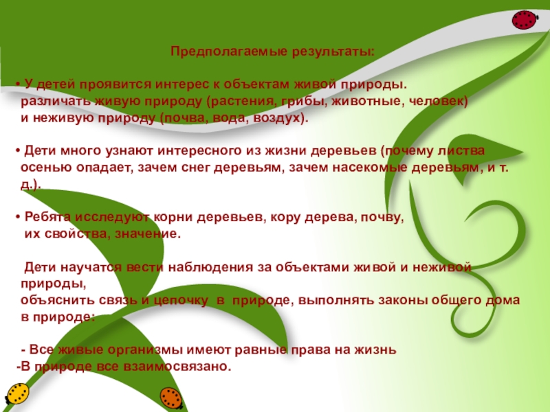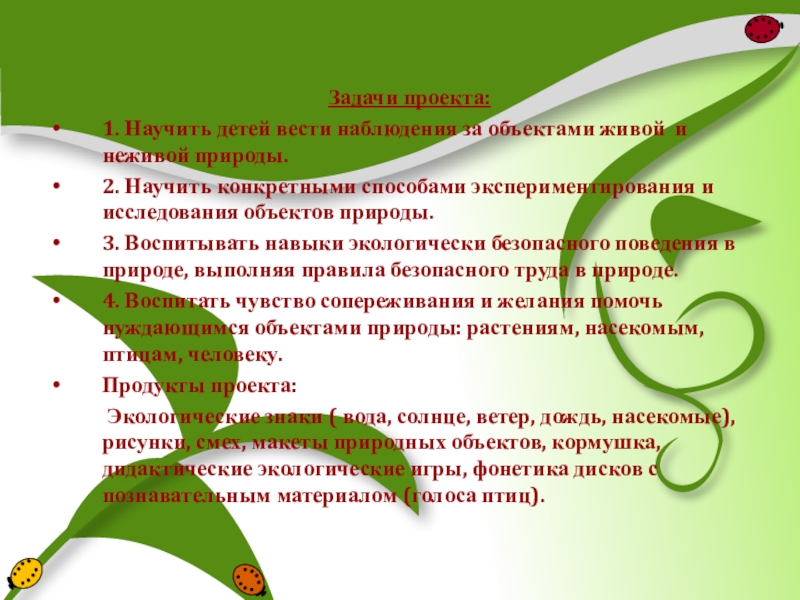 4. Воспитать чувство сопереживания и желания помочь нуждающимся объектами природы: растениям, насекомым, птицам, человеку.