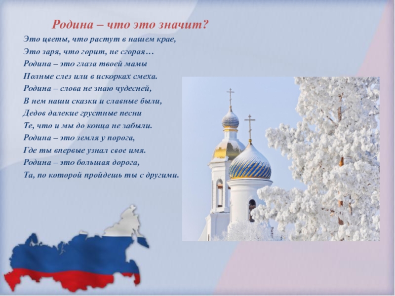 Понятие «Патриотизм» включает в себя любовь к Родине, к земле, где родился и вырос, гордость за исторические свершения своего народа.