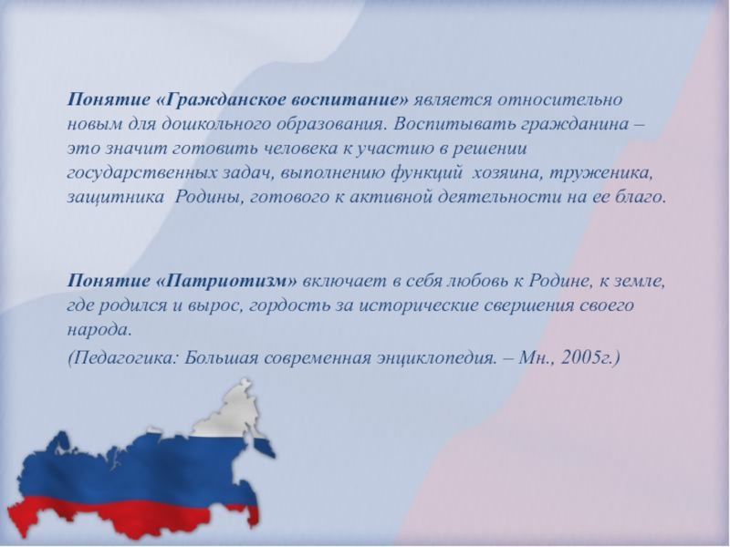 Слайд 4Понятие «Гражданское воспитание» является относительно новым для дошкольного образования. Воспитывать гражданина