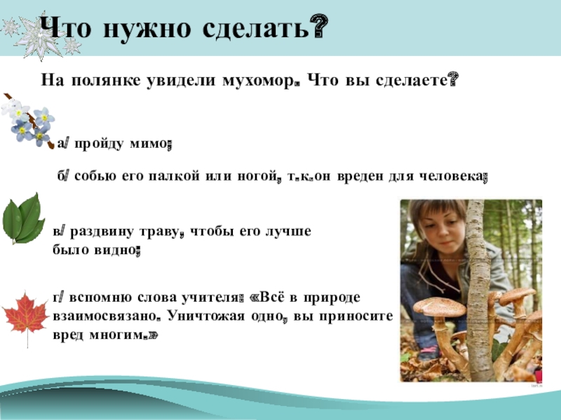 г/ вспомню слова учителя: «Всё в природе взаимосвязано. Уничтожая одно, вы приносите вред многим.»