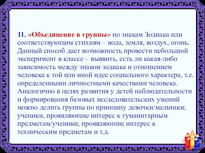 Деление по произвольным признакам. Можно объединять людей в микрогруппу по одному произвольному признаку, например, по временам года, цвету волос, одежды. Если группа достаточно большая и нужно поделить ее на две подгруппы, попросите участников встать по четырем углам. В один угол те, кто родился весной, в другой, те, кто родился летом и т.д. Далее, объедините подгруппы по своему усмотрению. Важно территориально обозначить место, куда будут собираться группы.