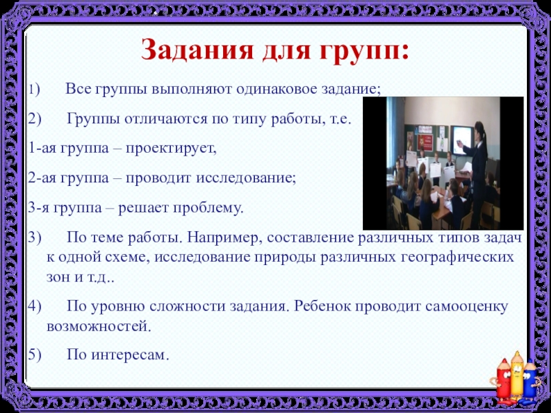 3) По теме работы. Например, составление различных типов задач к одной схеме, исследование природы различных географических зон и т.д..
