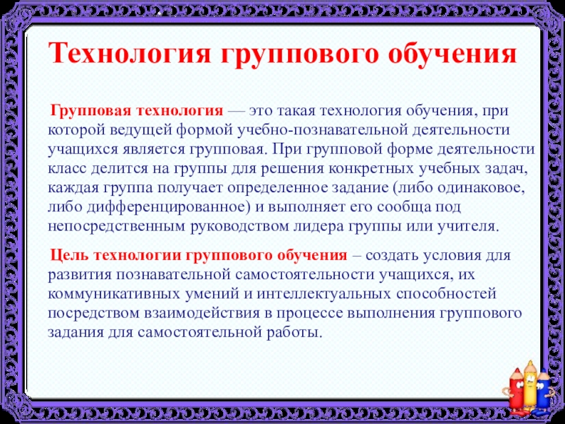 Цель технологии группового обучения – создать условия для развития познавательной самостоятельности учащихся, их коммуникативных умений и интеллектуальных способностей посредством взаимодействия в процессе выполнения группового задания для самостоятельной работы.