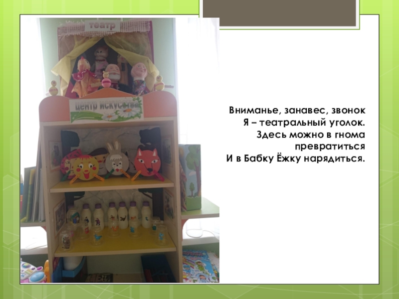 Вниманье, занавес, звонокЯ – театральный уголок.Здесь можно в гнома превратитьсяИ в Бабку Ёжку нарядиться.