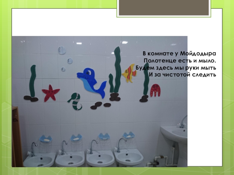 В комнате у МойдодыраПолотенце есть и мыло.Будем здесь мы руки мытьИ за чистотой следить