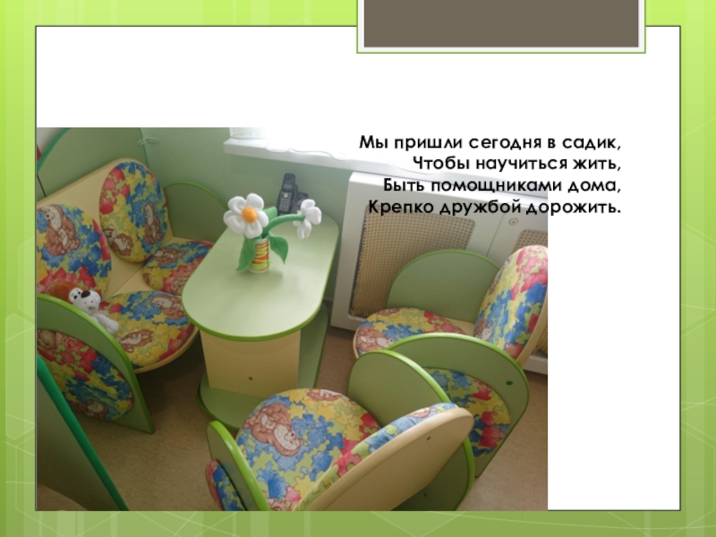 Мы пришли сегодня в садик,Чтобы научиться жить,Быть помощниками дома,Крепко дружбой дорожить.