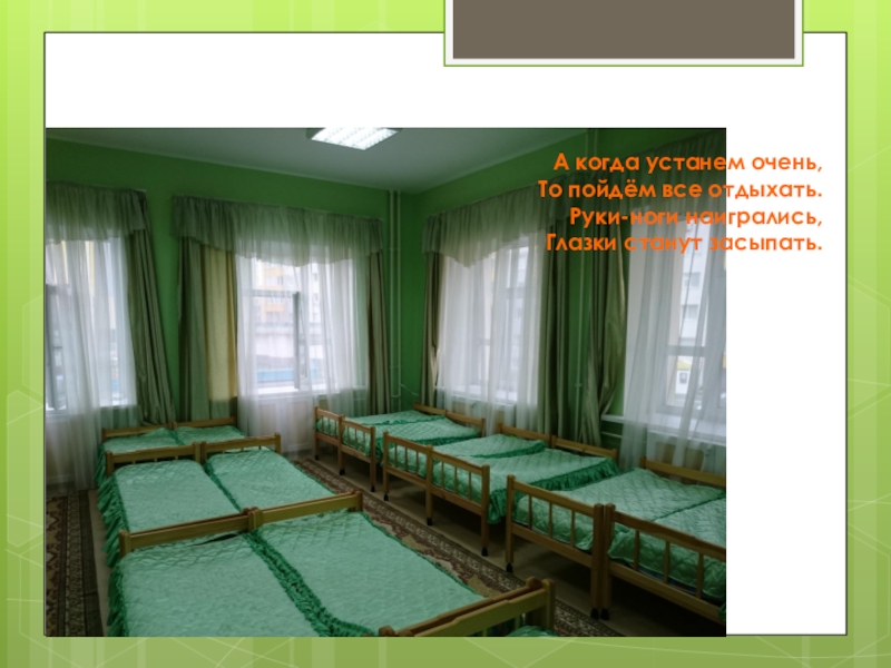 А когда устанем очень,То пойдём все отдыхать.Руки-ноги наигрались,Глазки станут засыпать.