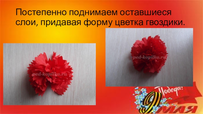 Слайд 9Постепенно поднимаем оставшиеся слои, придавая форму цветка гвоздики.