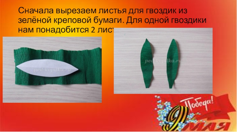 Слайд 3Сначала вырезаем листья для гвоздик из зелёной креповой бумаги. Для одной