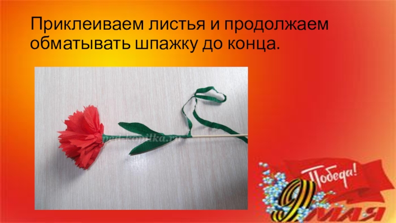 Слайд 12Приклеиваем листья и продолжаем обматывать шпажку до конца.