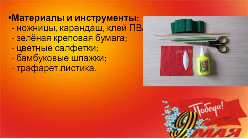 Материалы и инструменты: - ножницы, карандаш, клей ПВА; - зелёная креповая бумага; - цветные салфетки; - бамбуковые