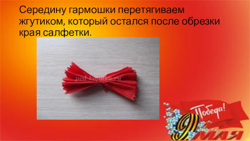Слайд 7Середину гармошки перетягиваем жгутиком, который остался после обрезки края салфетки.