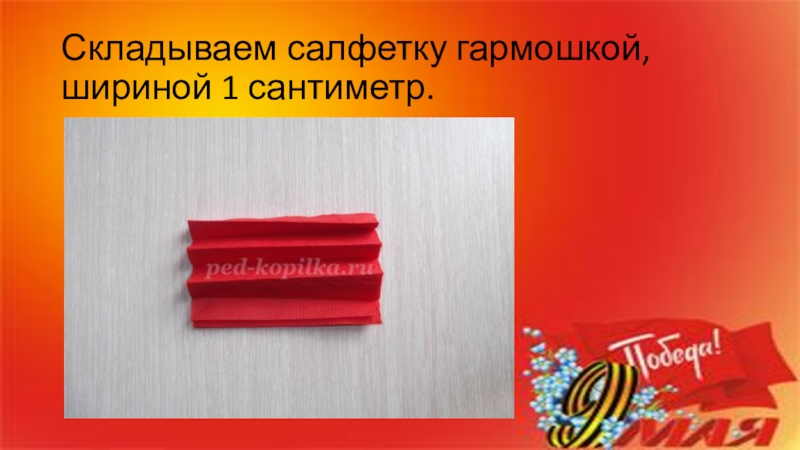 Слайд 5Складываем салфетку гармошкой, шириной 1 сантиметр.