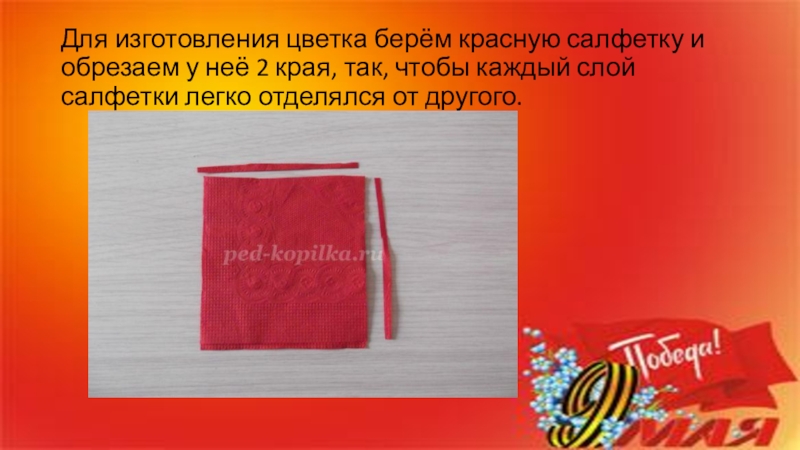 Слайд 4Для изготовления цветка берём красную салфетку и обрезаем у неё 2