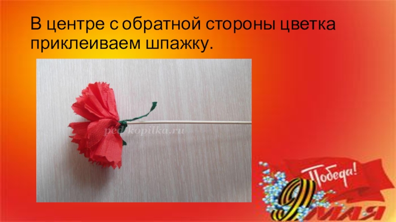 Слайд 10В центре с обратной стороны цветка приклеиваем шпажку.