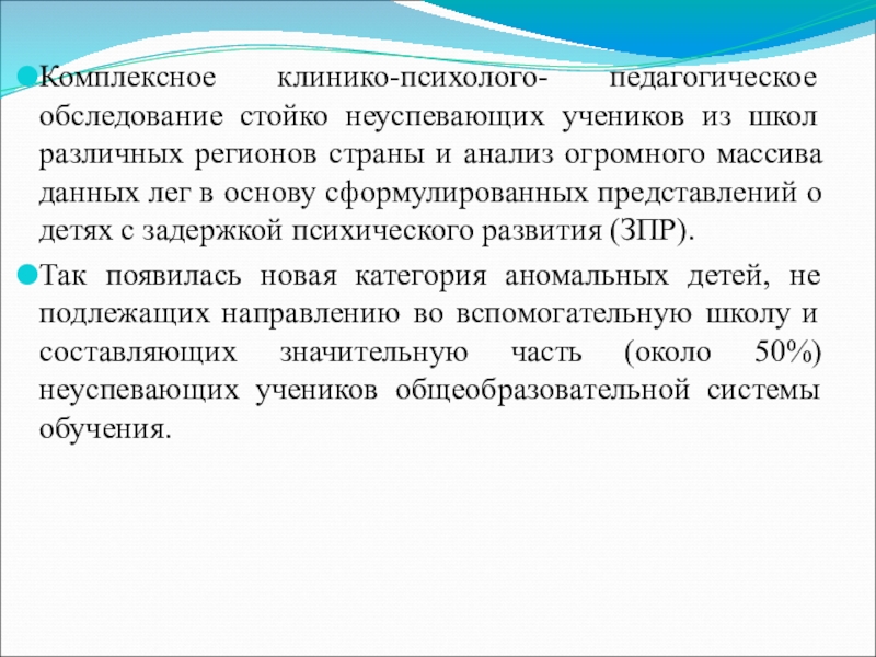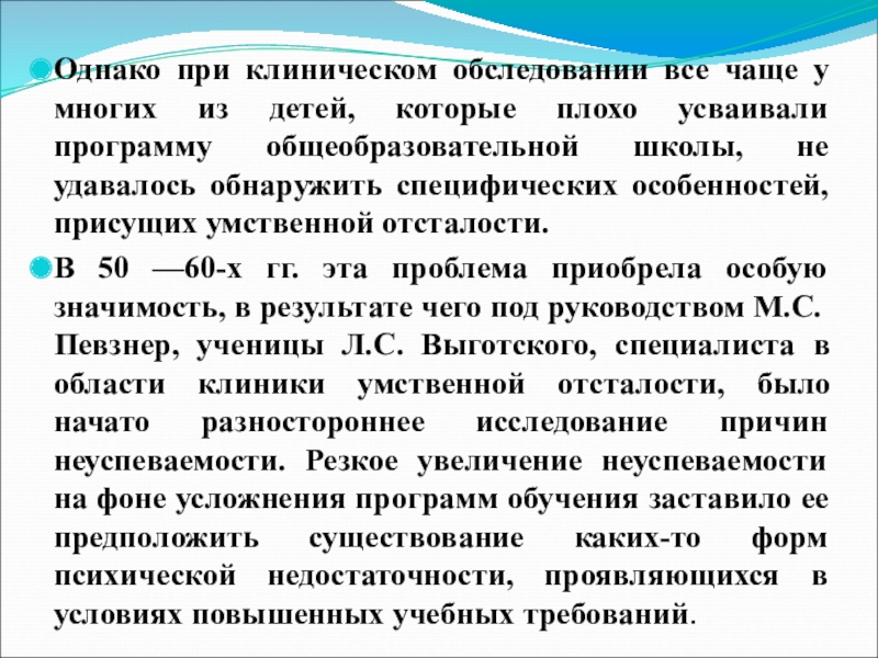 В 50 —60-х гг. эта проблема приобрела особую значимость, в результате чего под руководством М.С.Певзнер, ученицы Л.С. Выготского, специалиста в области клиники умственной отсталости, было начато разностороннее исследование причин неуспеваемости. Резкое увеличение неуспеваемости на фоне усложнения программ обучения заставило ее предположить существование каких-то форм психической недостаточности, проявляющихся в условиях повышенных учебных требований.