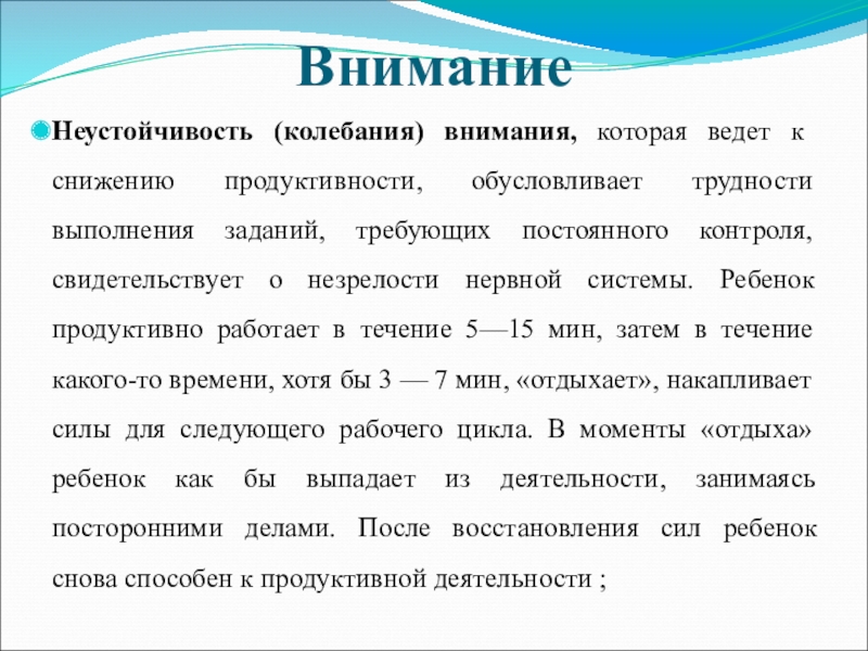 Неустойчивость (колебания) внимания, которая ведет к снижению продуктивности, обусловливает трудности выполнения