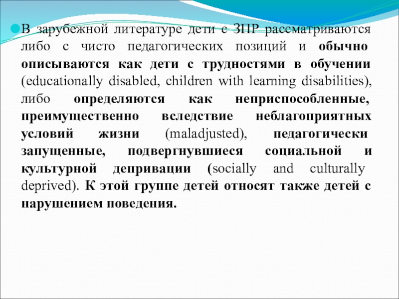 Слайд 2В зарубежной литературе дети с ЗПР рассматриваются либо с чисто педагогических