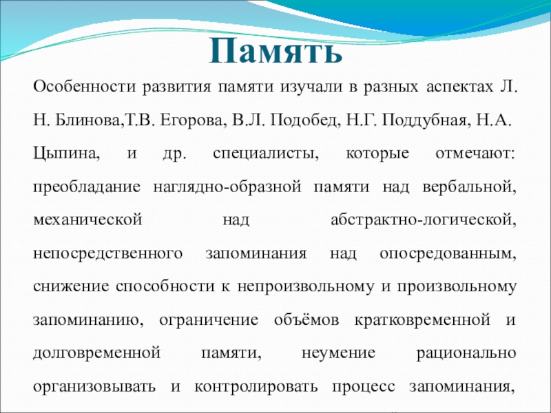 Особенности развития памяти изучали в разных аспектах Л.Н. Блинова,Т.В. Егорова, В.Л.