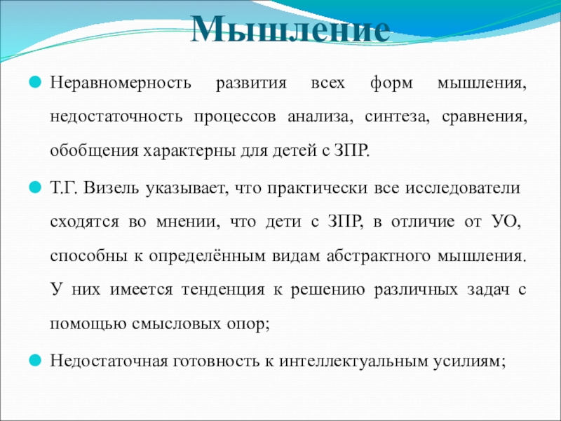 Т.Г. Визель указывает, что практически все исследователи сходятся во мнении, что дети с ЗПР, в отличие от УО, способны к определённым видам абстрактного мышления. У них имеется тенденция к решению различных задач с помощью смысловых опор;