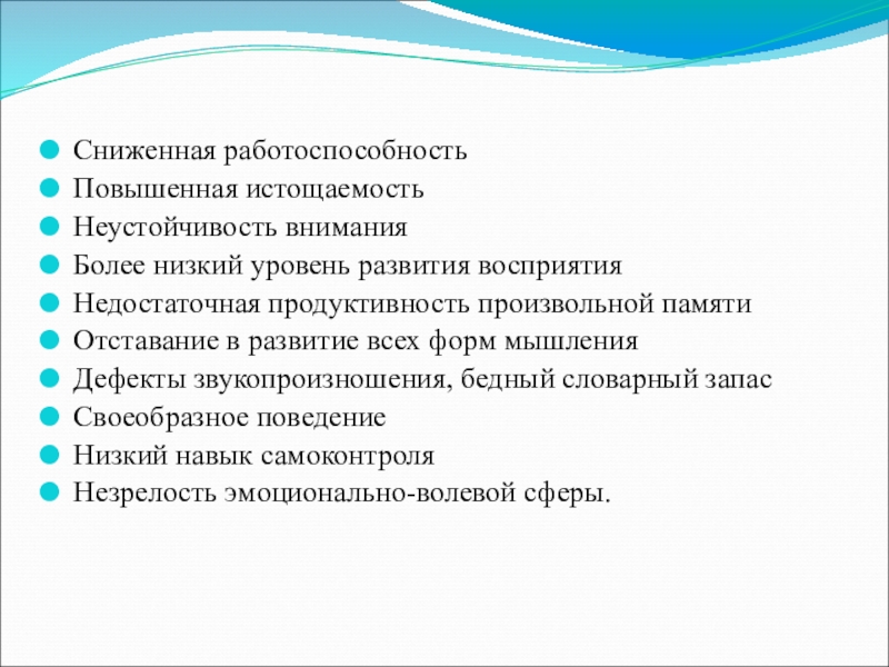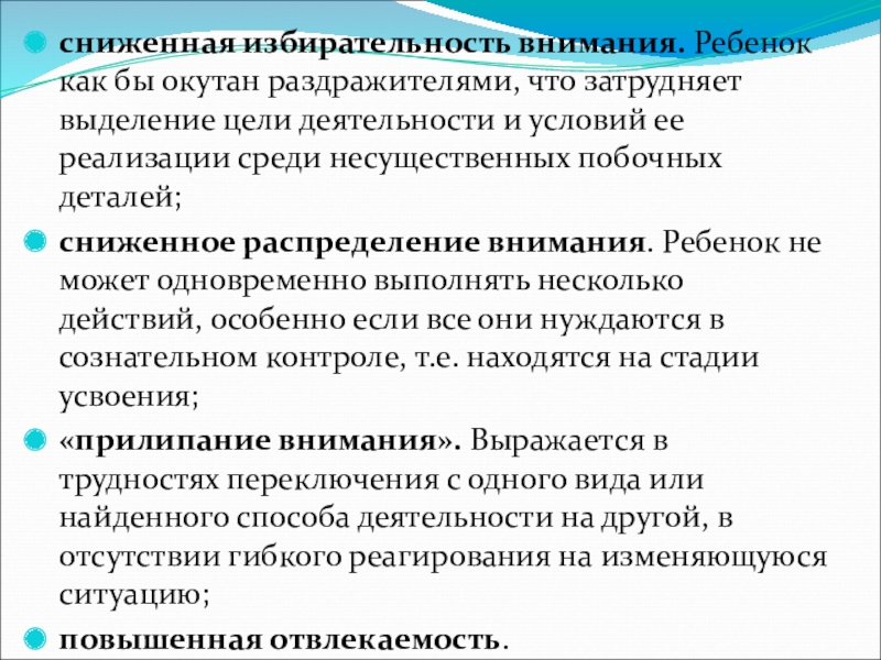 Слайд 21сниженная избирательность внимания. Ребенок как бы окутан раздражителями, что затрудняет выделение