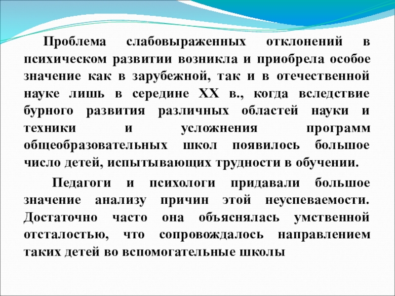 Проблема слабовыраженных отклонений в психическом развитии возникла и приобрела особое значение