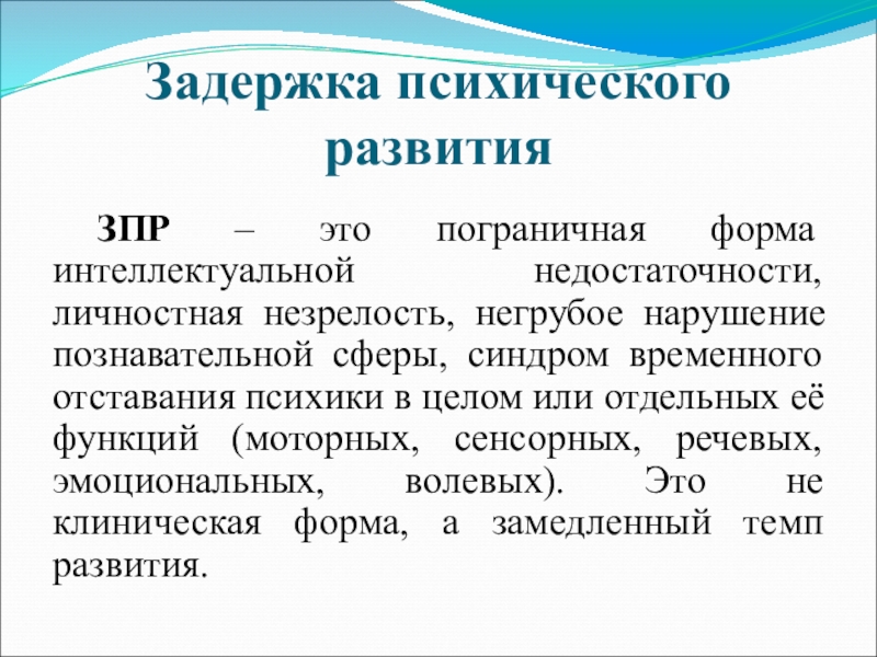негрубое нарушение познавательной сферы, синдром временного отставания психики в целом или отдельных её функций (моторных, сенсорных, речевых, эмоциональных, волевых). Это не клиническая форма, а замедленный темп развития.