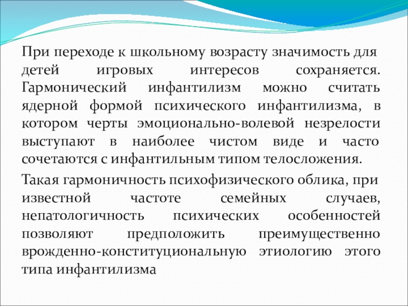 Гармонический инфантилизм можно считать ядерной формой психического инфантилизма, в котором черты эмоционально-волевой незрелости выступают в наиболее чистом виде и часто сочетаются с инфантильным типом телосложения.