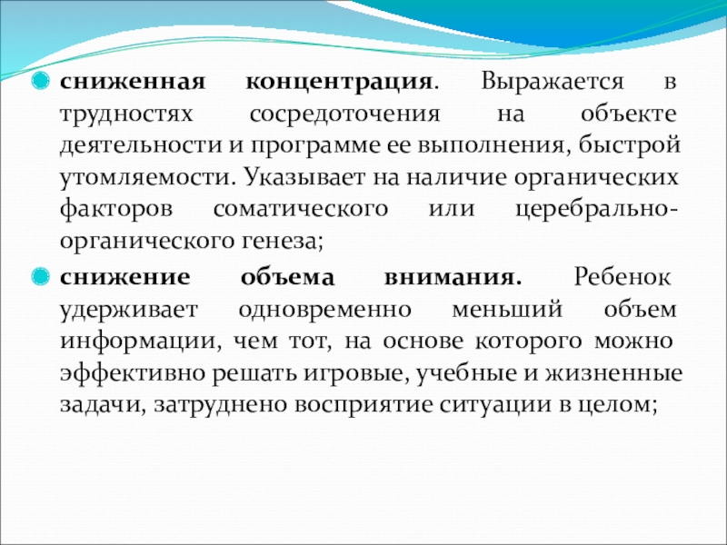 Слайд 20сниженная концентрация. Выражается в трудностях сосредоточения на объекте деятельности и программе