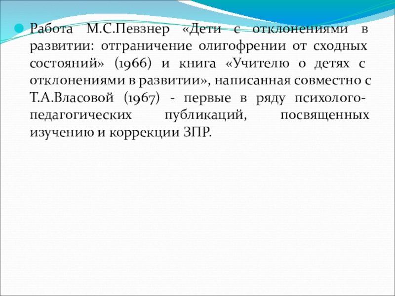 Слайд 8Работа М.С.Певзнер «Дети с отклонениями в развитии: отграничение олигофрении от сходных