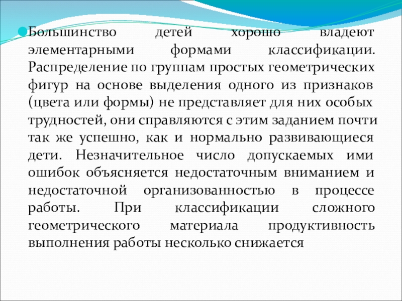 геометрических фигур на основе выделения одного из признаков (цвета или формы) не представляет для них особых трудностей, они справляются с этим заданием почти так же успешно, как и нормально развивающиеся дети. Незначительное число допускаемых ими ошибок объясняется недостаточным вниманием и недостаточной организованностью в процессе работы. При классификации сложного геометрического материала продуктивность выполнения работы несколько снижается