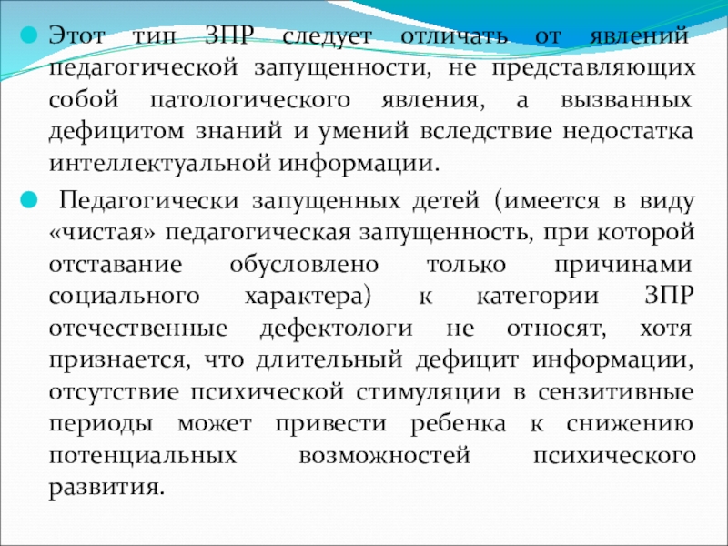 Педагогически запущенных детей (имеется в виду «чистая» педагогическая запущенность, при которой отставание обусловлено только причинами социального характера) к категории ЗПР отечественные дефектологи не относят, хотя признается, что длительный дефицит информации, отсутствие психической стимуляции в сензитивные периоды может привести ребенка к снижению потенциальных возможностей психического развития.